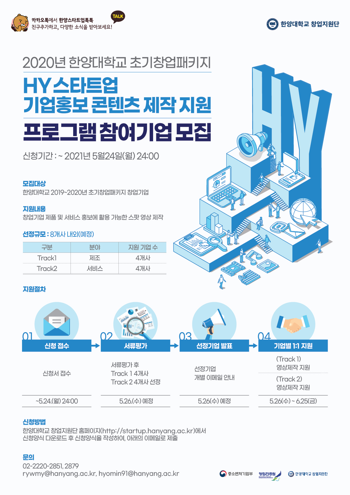 696한양대학교 창업지원단에서는 창업기업 맞춤형 홍보물 제작 지원을 통해 기업의 다방면 마케팅 지원을 강화하기 위해 아래와 같이 HY 스타트업 기업홍보 콘텐츠 제작 지원 프로그램을 운영합니다. 관심있는 분들의 많은 참여 바랍니다.