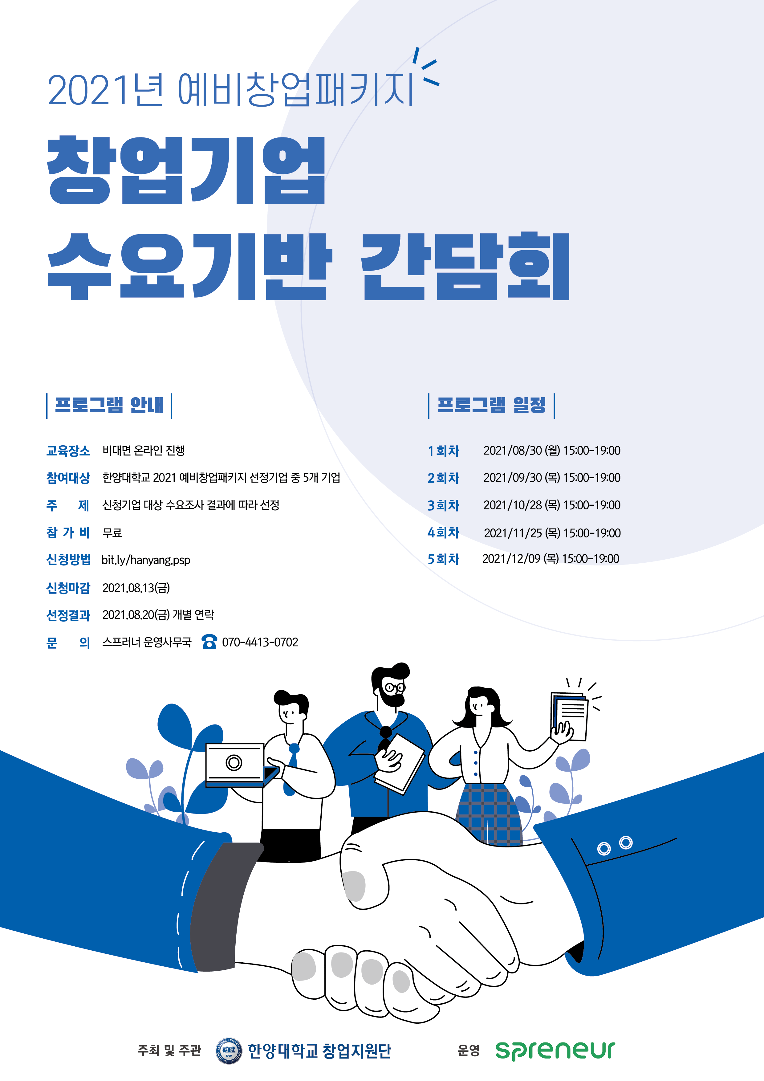 ▶ 문의처: 한양대학교 예비창업패키지 ☎ 02-2220-2857(김하영 매니저)