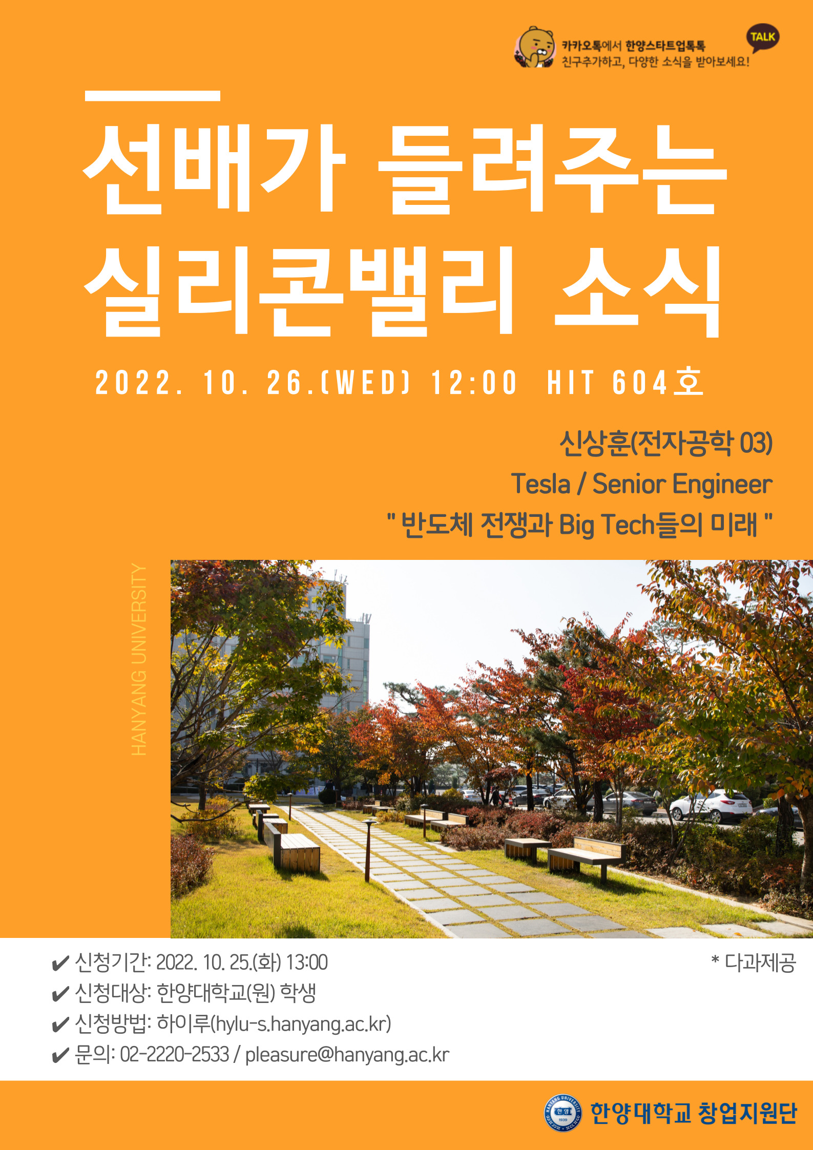 한양대학교 창업지원단에서는 (예비)학생창업자 여러분을 위해 한양대학교 졸업한 선배님을 통해 실리콘밸리 소식을 알 수 있는 시간을 준비했습니다.