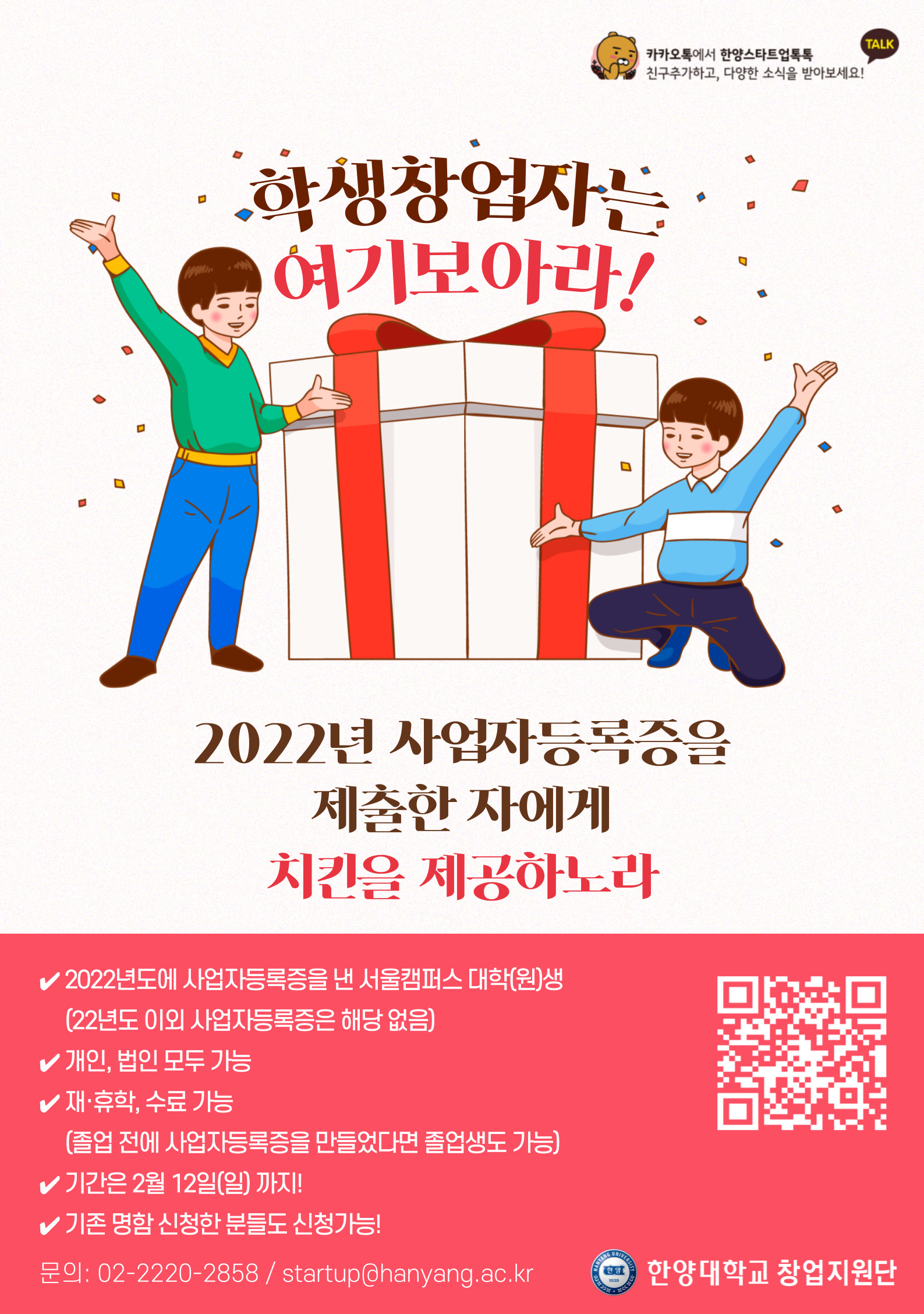 '2022년 1월 1일~12월 31일' 내 창업한 한양대생이 구글 설문지를 통해 사업자 등록증을 제출하면 치킨 기프티콘 드립니다!