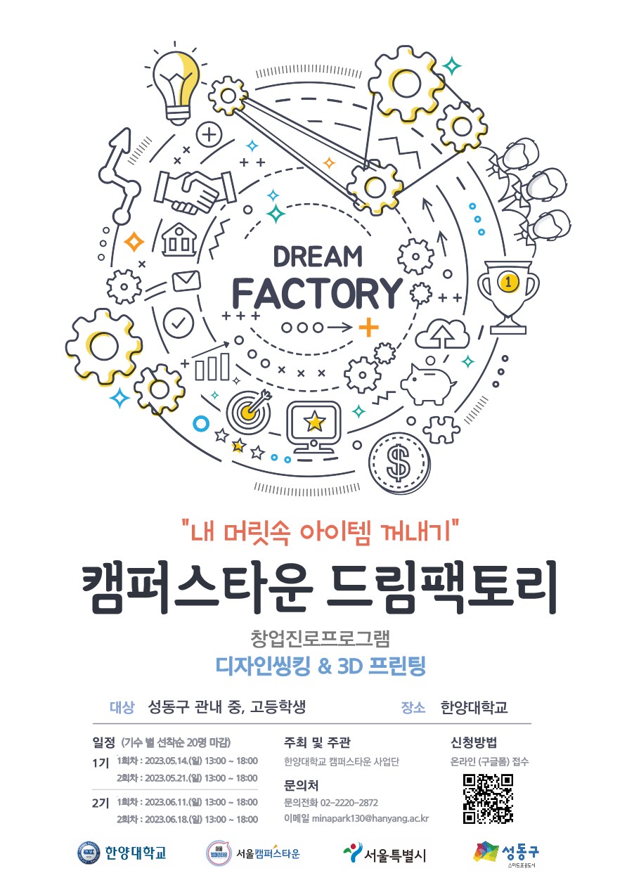《드림팩토리》 드림팩토리는, 성동구 관내 청소년을 대상으로 창업 진로 체험과 4차산업 분야를 실습할 수 있는 오픈 클래스입니다. 디자인 씽킹 & 디지털 3D 프린팅 프로그램을 통해 청소년의 진로 탐색 과정에서 본인의 아이디어를 구체화하고 실제 아이템을 제작해보는 경험을 통해 창의융합 역량을 강화시킬 수 있습니다. |