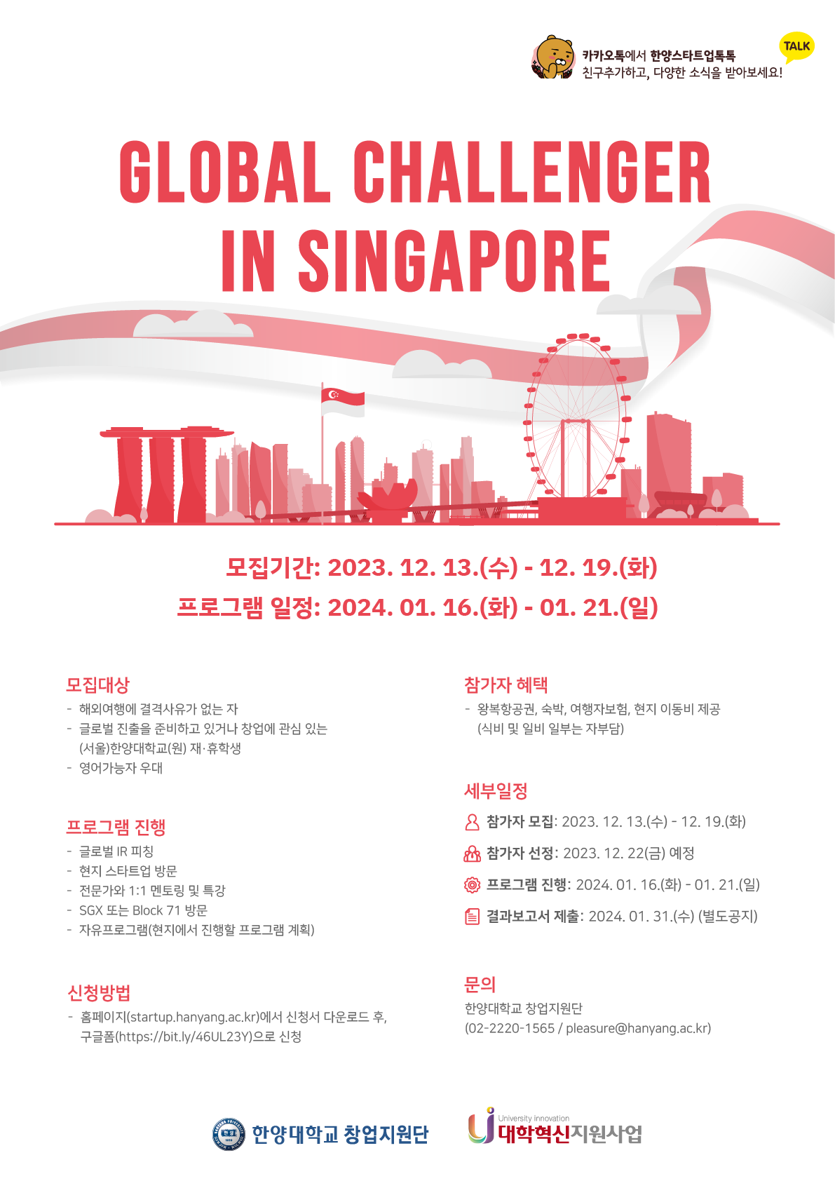 창업지원단에서는 (예비)학생창업자들에게 싱가포르 현지에 방문하여 기업탐방, 현지 전문가와 멘토링 및 네트워킹 등 다양한 프로그램을 제공하고자 아래와 같이 참가자 모집을 하고 있습니다.