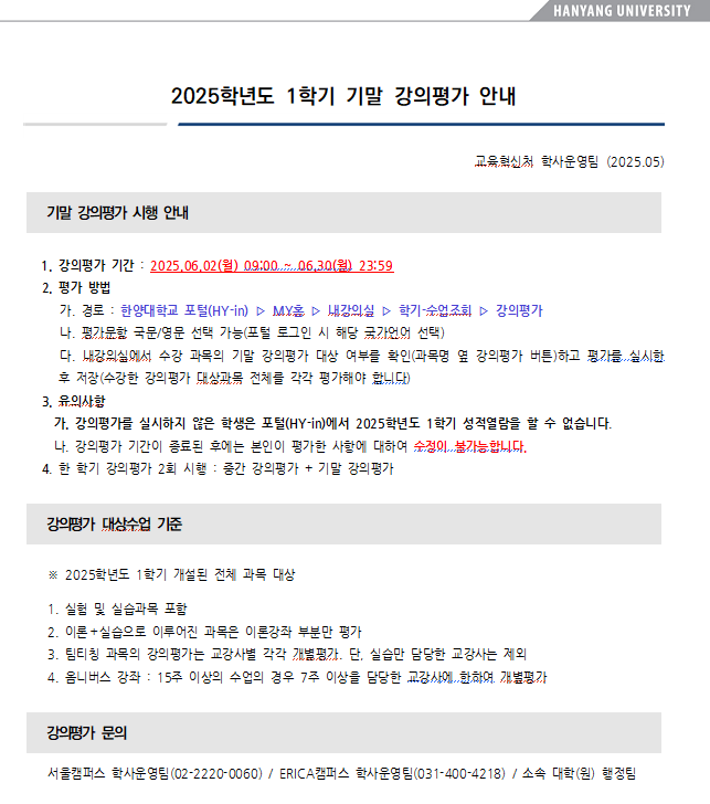 2025학년도 1학기 기말 강의평가 안내 2025.06.02(월) 09:00 ~ 06.30(월) 23:59
