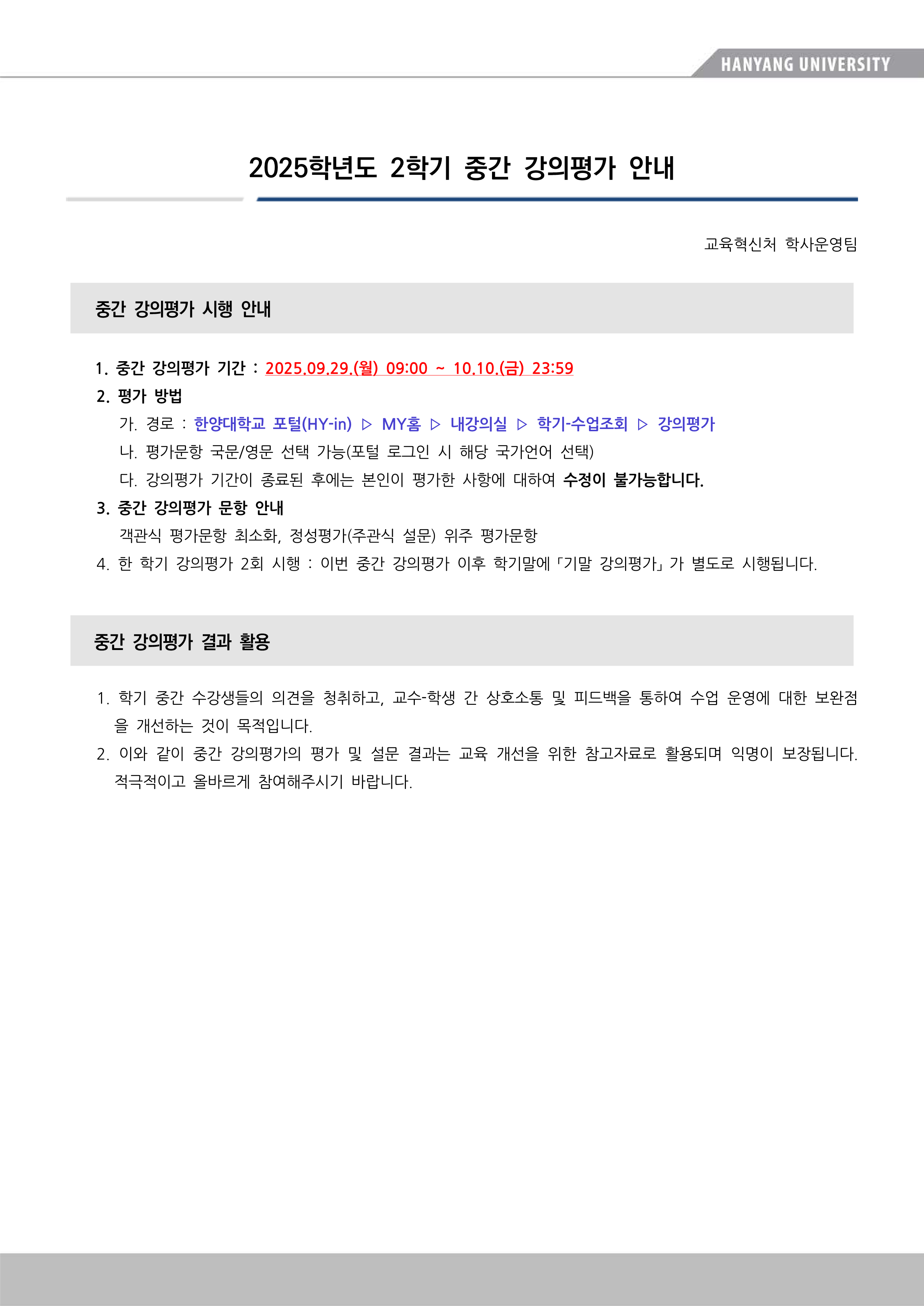 2025학년도 2학기 중간 강의평가 안내
