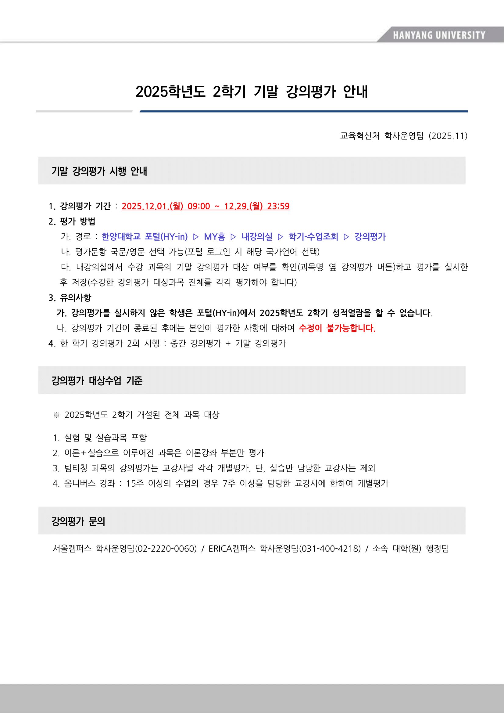 강의평가를 하지 않은 학생은 해당학기 성적열람(HY-in)이 불가하므로, 이로 인한 불이익을 받지 않도록