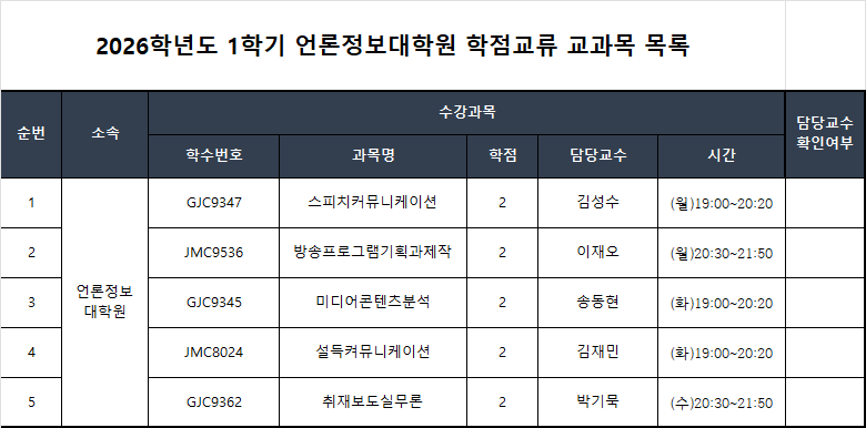 - 위 과목 중 수강 희망 과목 첨부파일 양식에 맞춰 작성하여 행정팀에 이메일 송부
