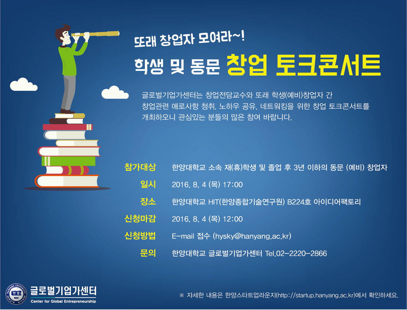 한양대학교 글로벌기업가센터에는 창업전담교수와 또래 창업자 간 창업관련 애로사항 청취, 노하우 공유, 네트워킹을 위한 창업 토크콘서트를 개최하오니 관심있는 분들의 많은 참여를 바랍니다.