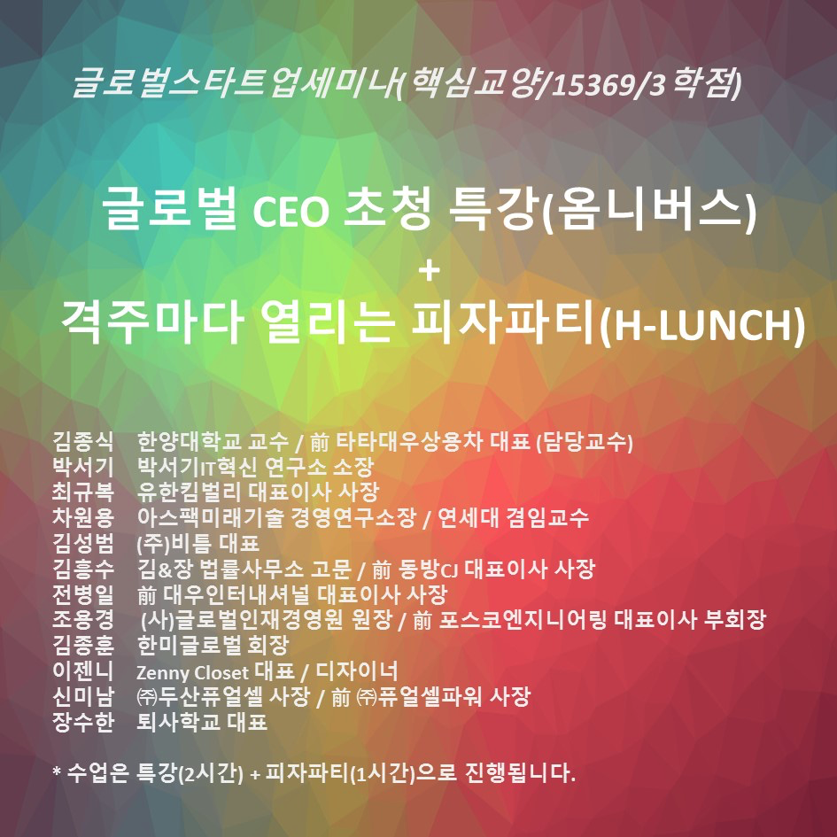 * 창업심화:글로벌스타트업세미나(핵심교양/15369/3학점/수요일 09:00 ~ 12:00)