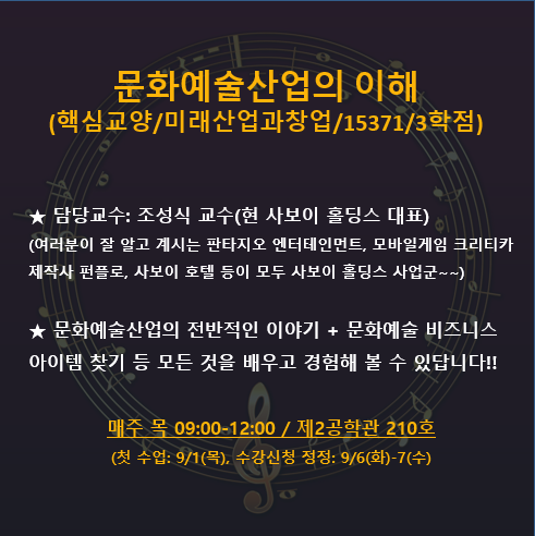 * 창업기초:문화에술산업의이해(핵심교양/15371/3학점/목요일 09:00 ~ 12:00)