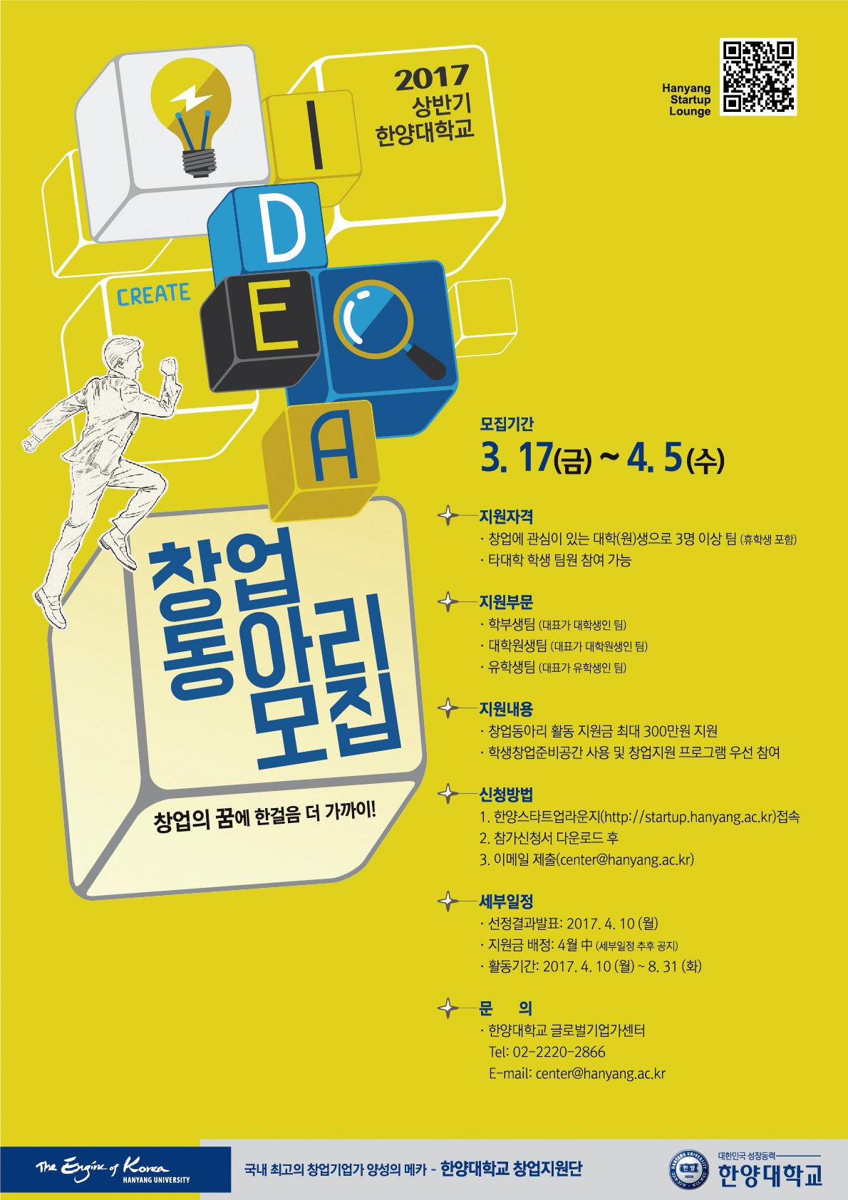 한양대학교 글로벌기업가센터에서는 참신한 아이디어를 보유한 대학생 창업동아리를 발굴ㆍ지원하여 창업에 대한 긍정적인 분위기를 조성하고 청년 창업을 촉진하고자 아래와 같이 창업동아리 회원을 모집합니다.