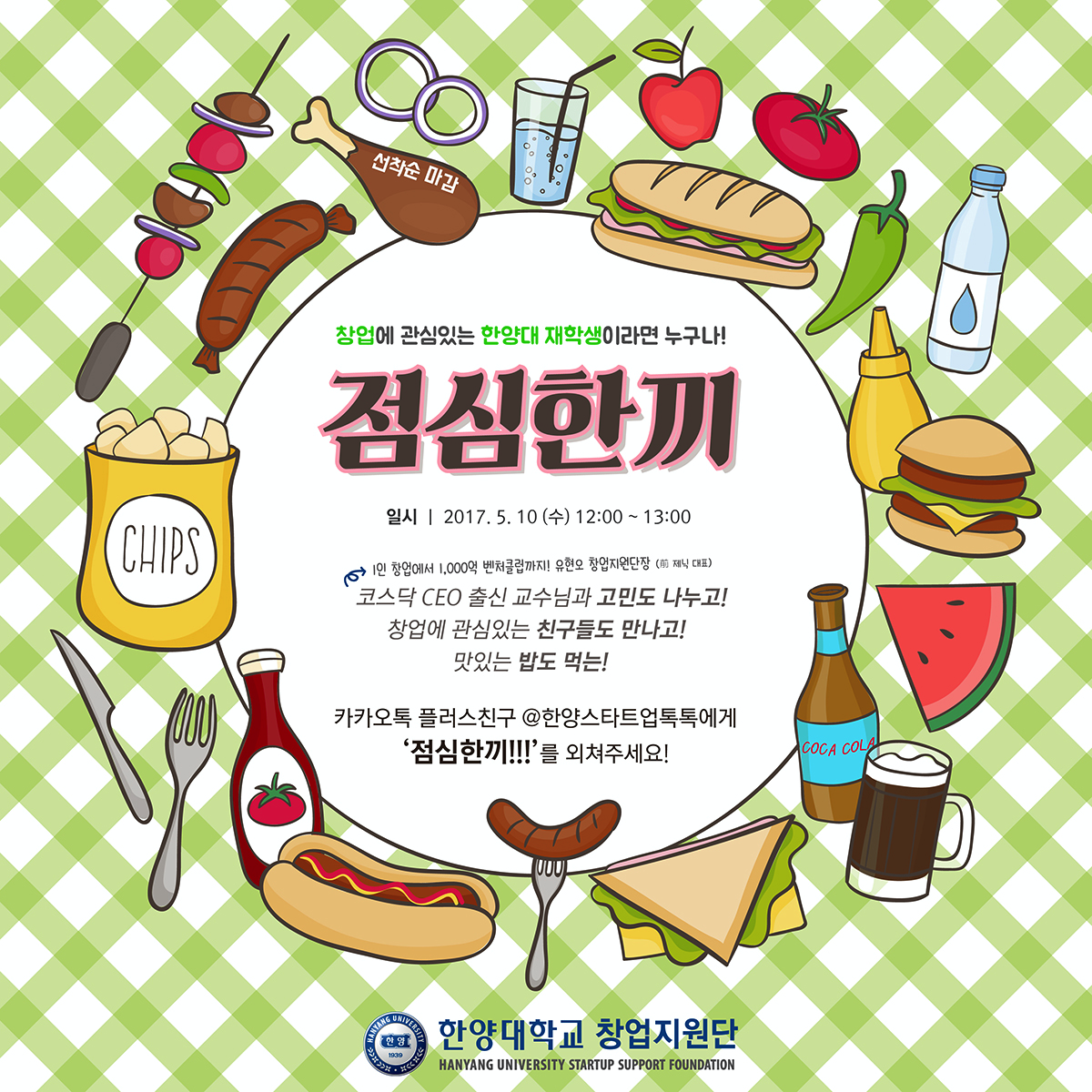 창업에 관심있는 재(휴)학생은 누구나 참여 가능하며, 카카오톡 플러스친구 @한양스타트업톡톡으로 '점심한끼!!!'를 외쳐주시면 됩니다. (선착순 마감)