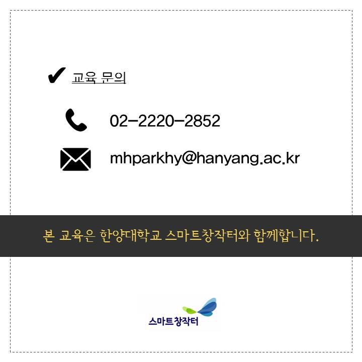 [문의사항] 한양대 스마트창작터 담당자 박미향 02-2220-2852, mhparkhy@hanyang.ac.kr