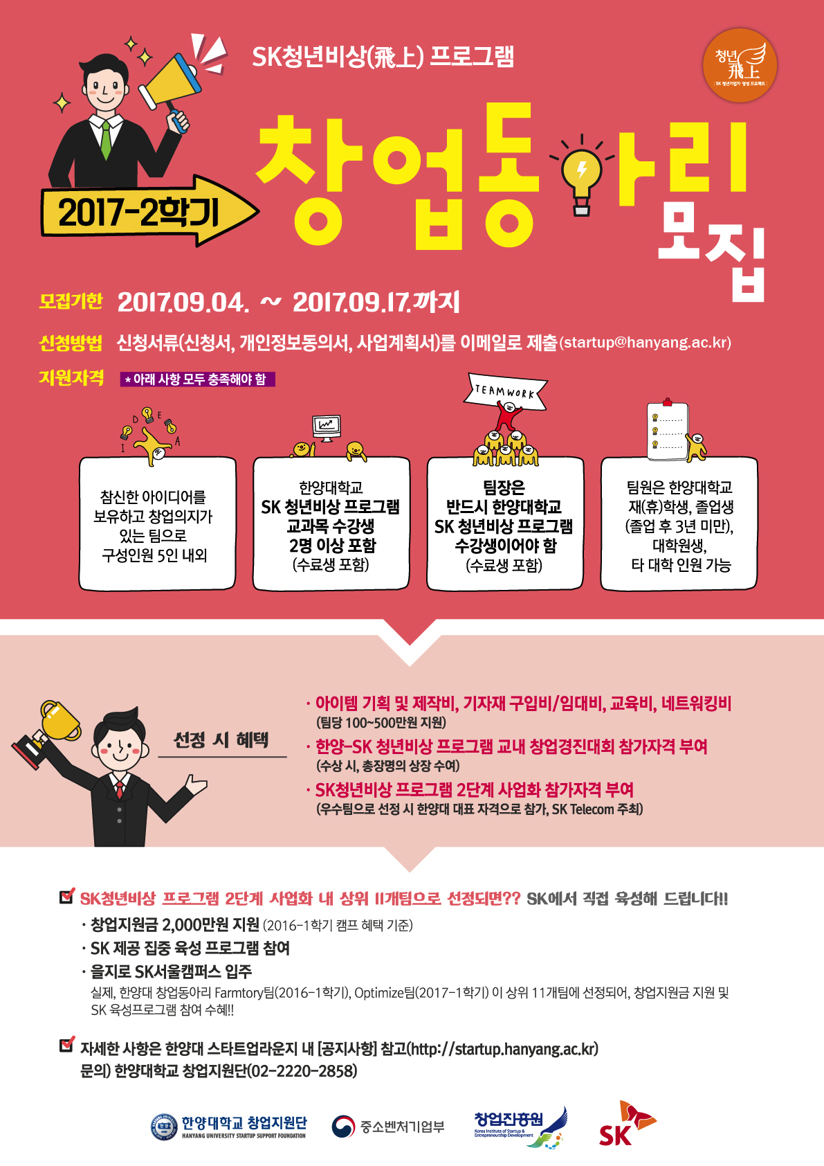제출시 파일명: (팀명)2017-2 한양-SK 창업동아리 신청서, (팀명)2017-2 한양-SK 창업동아리 개인정보동의서, (팀명)2017-2 한양-SK 창업동아리 사업계획서