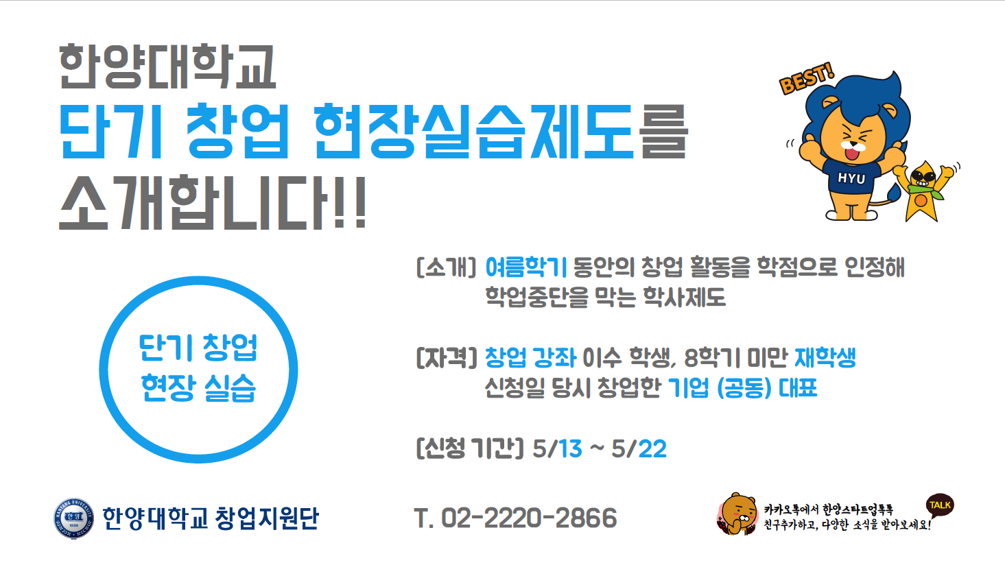 | 단기현장실습 | 계절학기 신청(05/13~22) * 매 계절학기 중 1회 허용(창업융합전공 또는 일반선택학점 3학점 인정) |