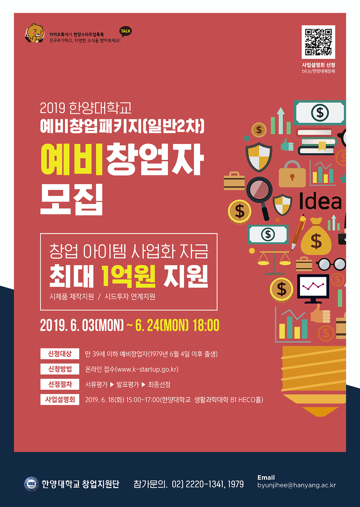 219한양대학교 창업지원단에서는 혁신적인 기술 창업 소재가 있는 청년 예비 창업자를 육성하기 위한 『2019년 예비창업패키지』 에 참여할 예비 창업자를 다음과 같이 모집합니다.